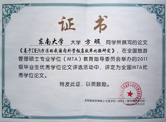 日前,我院旅游学系旅游管理专业硕士(MTA)毕业生方璇的论文《基于DEA方法的我国内外资饭店效率比较研究》,在全国旅游管理硕士专业学位(MTA)教育指导委员会举办的2011级毕业生优秀学位论文评选活动中,被评定为MTA优秀学位论文。全国旅游管理专业硕士(MTA)于2010年设立,2011年首次招生,2014年迎来首届毕业生。