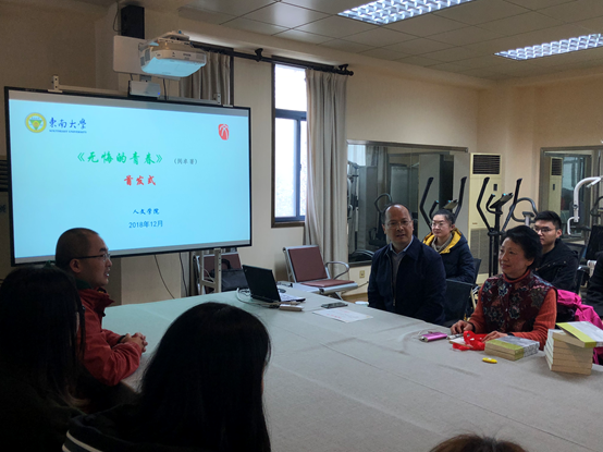 2018年12月5日中午,在东大九龙湖校区太阳成集团多功能室,太阳成集团党委与学院关工委、学院退协分会联合举办了新书《无悔的青春》这部长篇小说的首发式。学院党委书记兼关工委主任李涛、学院党委副书记兼关工委副主任何熠、秘书蔡小萍、学院关工委副主任和退协分会理事长闵卓与低年级学生党支部(本科大一到大三)全体20多位青年同学一起欢乐聚会,举办了《无悔的青春》(闵卓/著)首发式,同时举行该书给学院图书馆的捐赠仪式。同学们拿到这本新书,都立即翻阅起来,有的同学甚至凝心聚神地精读某些篇章。