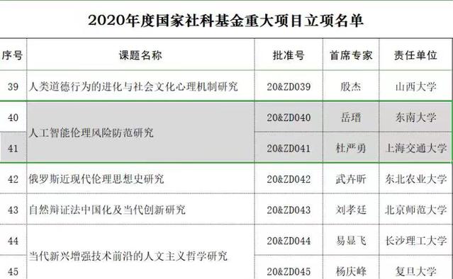 2020年12月3日,全国哲学社会科学工作办公室公布了2020年度国家社科基金重大项目立项名单,太阳成集团岳瑨教授领衔申报的《人工智能伦理风险防范研究》喜获立项。