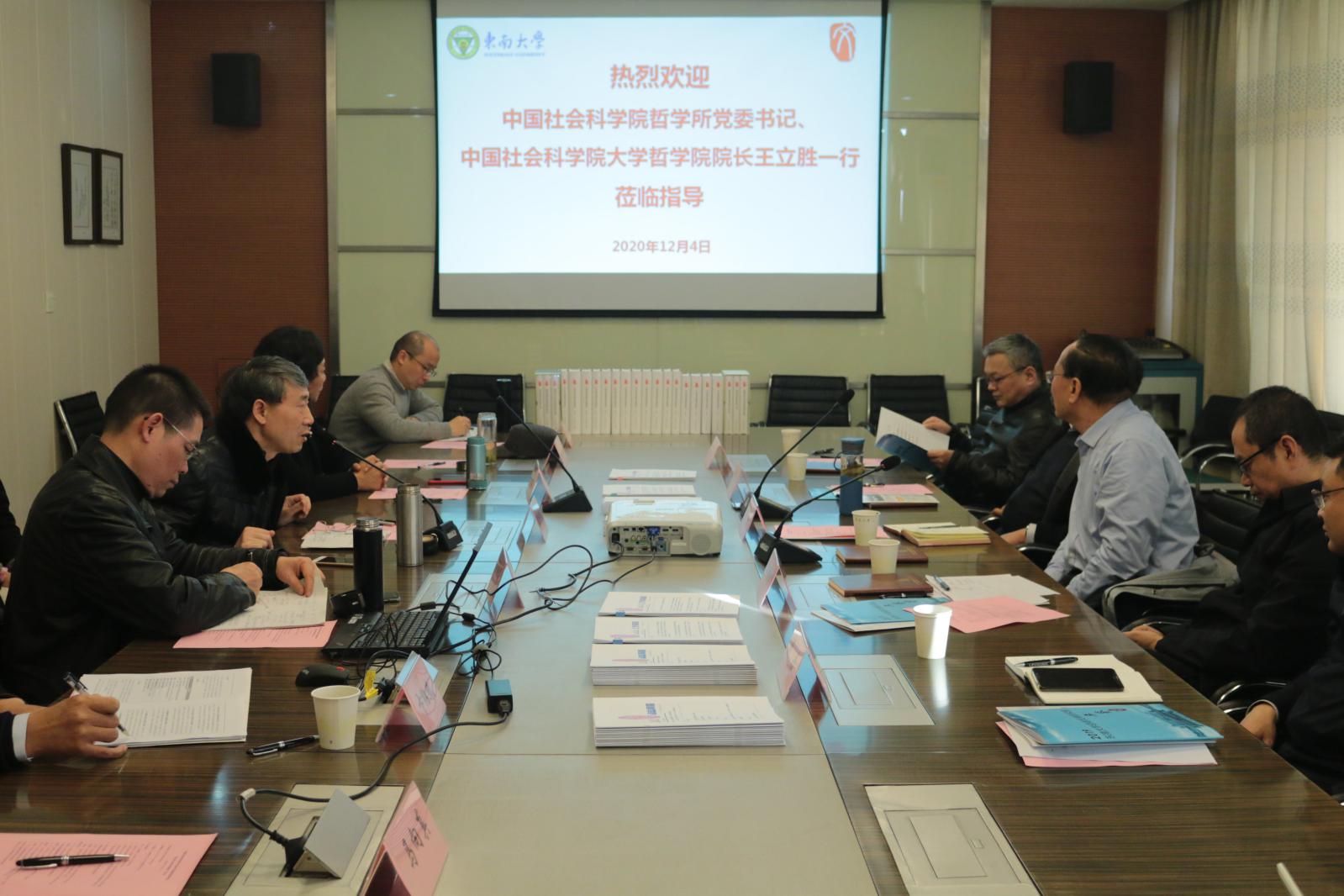 2020年12月4日下午,中国社会科学院哲学研究所党委书记、中国社会科学院大学哲学院院长王立胜,中国社会科学院哲学研究所副所长、《哲学动态》主编单继刚,中国社会科学院哲学研究所现代外国哲学研究室主任、中国社会科学院大学哲学院副院长马寅卯,中国社会科学院哲学研究所《哲学研究》编辑部主任周丹,中国社会科学院哲学研究所研究员孙春晨赴太阳集团哲学与科学系调研与交流。值此机会,双方联合举办了“新文科与哲学学科建设”研讨会,本次研讨会在太阳集团九龙湖校区太阳成集团国际会议中心召开。太阳集团人文社会科学学部主任、道德发展研究院院长、资深教授樊和平教授,太阳成集团院长王珏教授,太阳成集团副院长夏保华教授,哲学与科学系系主任卞绍斌教授以及哲学与科学系部分教师及道德发展研究院部分教师参加了此次会议。本次研讨会由太阳成集团院长王珏教授主持。