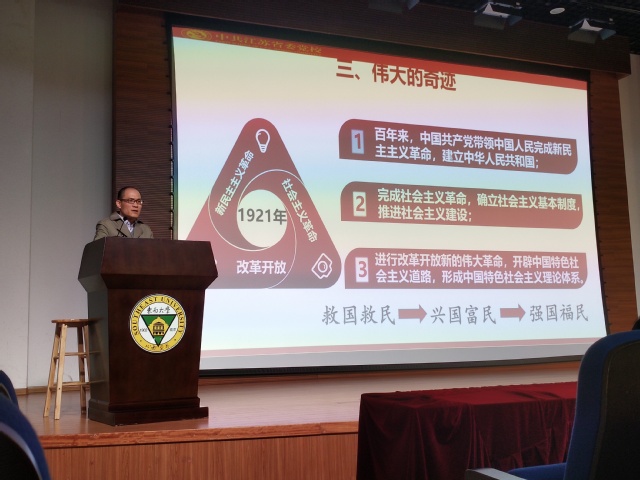 在“光辉的历程”部分,黄建军教授为在座师生讲述了中国共产党在历史进程中的诞生与成长,以“四个三”为框架再现了百年来风云变幻的历史——经历三个时期:新民主主义革命时期、社会主义探索时期、建设有中国特色的社会主义新时期。完成三件大事:完成了新民主主义革命,实现了民族独立、人民解放;完成了社会主义革命、确立了社会主义基本制度;进行了改革开放新的伟大革命,开创、坚持、发展了中国特色社会主义。开辟三条特色道路:农村包围城市、武装夺取政权的民主革命道路;和平改造的社会主义革命道路;具有中国特色的社会主义现代化建设道路。迎来三个伟大飞跃:中华民族迎来了从站起来、富起来到强起来的伟大飞跃;中国特色社会主义迎来了从创立、发展到完善的伟大飞跃;中国人民迎来了从温饱不足到小康富裕的伟大飞跃。