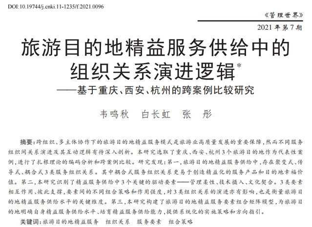 韦鸣秋,白长虹,张彤.旅游目的地精益服务供给中的组织关系演进逻辑——基于重庆、西安、杭州的跨案例比较研究[J].管理世界,2021,37(07):119-129+144+9.DOI:10.19744/j.cnki.11-1235/f.2021.0096.