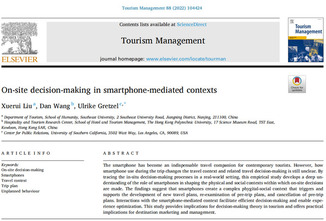 Liu, X., Wang, D., & Gretzel, U. (2022). On-site decision-making in smartphone-mediated contexts. Tourism Management, 88, 104424.
