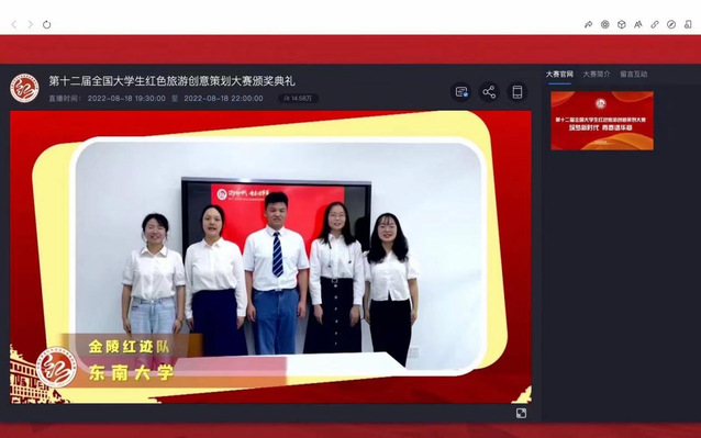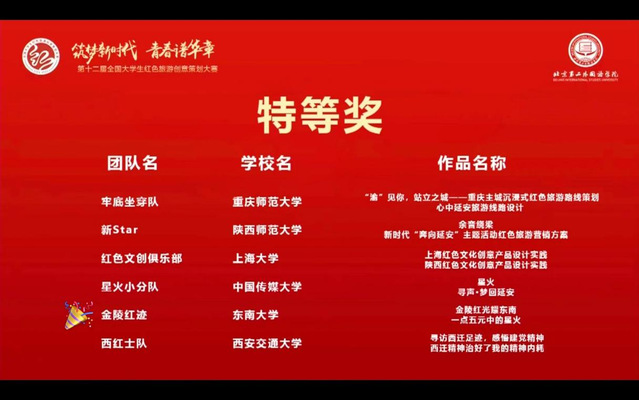 2022年8月18日,由文化和旅游部资源开发司、陕西省文化和旅游厅、延安市人民政府、北京第二外国语学院共同主办,教育部思想政治工作司、中共北京市委教育工作委员会、“学习强国”学习平台支持,中国旅游协会旅游教育分会等单位承办的第十二届全国大学生红色旅游创意策划大赛全国总决赛颁奖典礼在京举行。